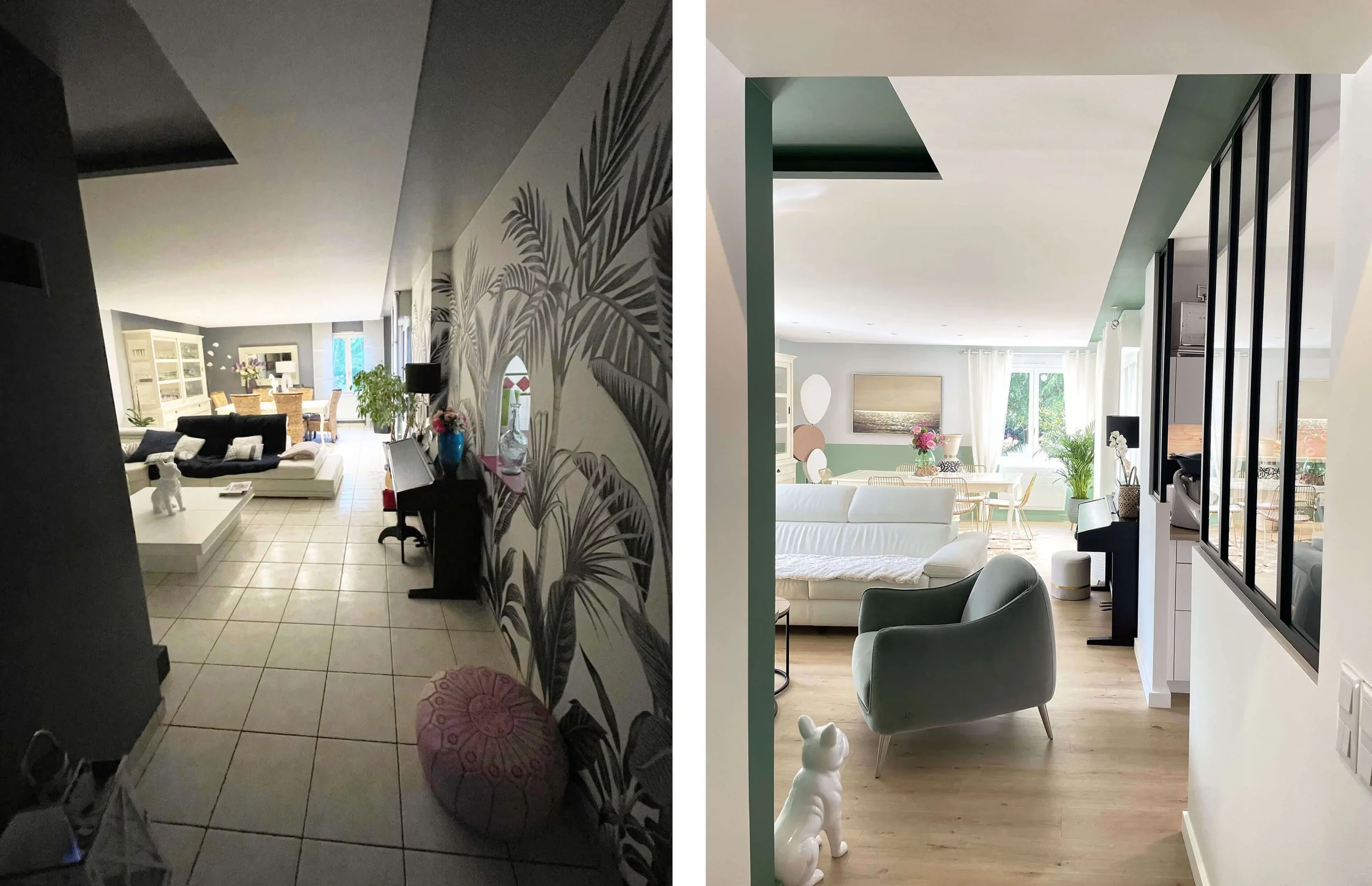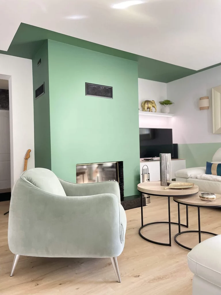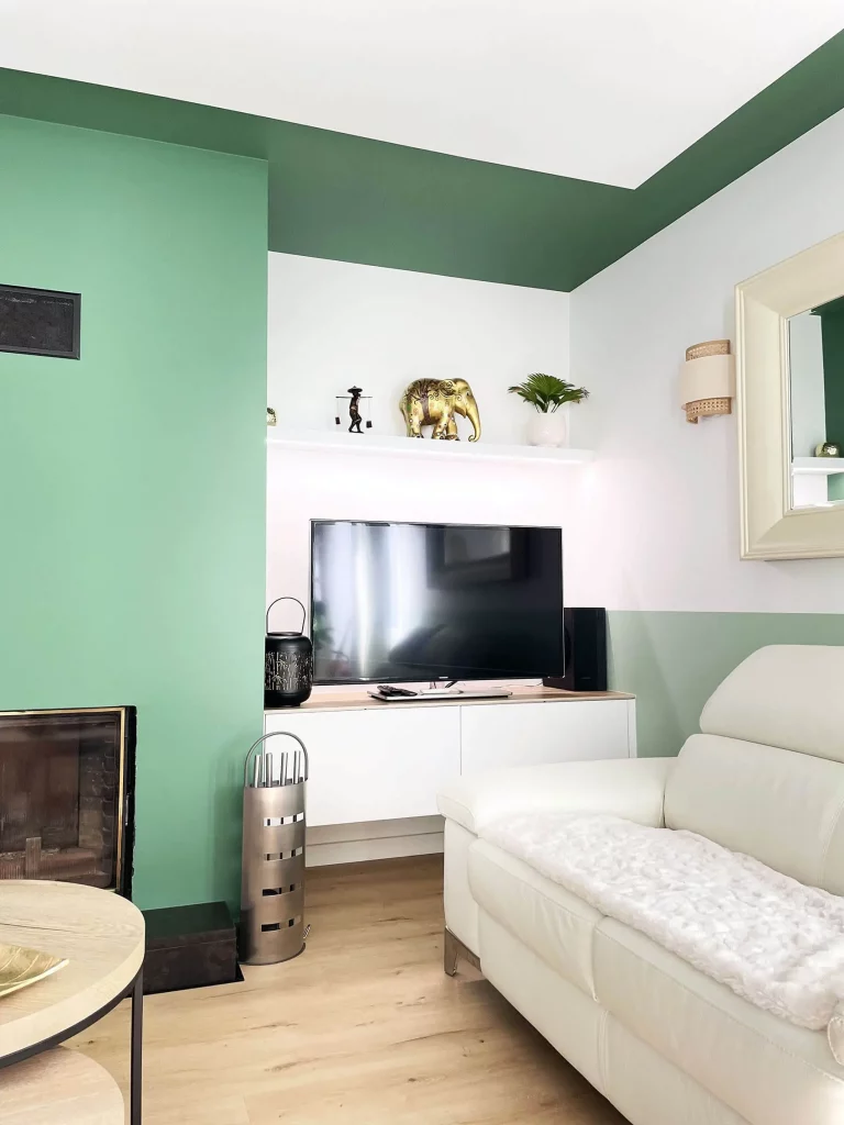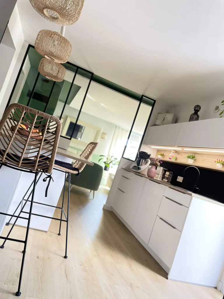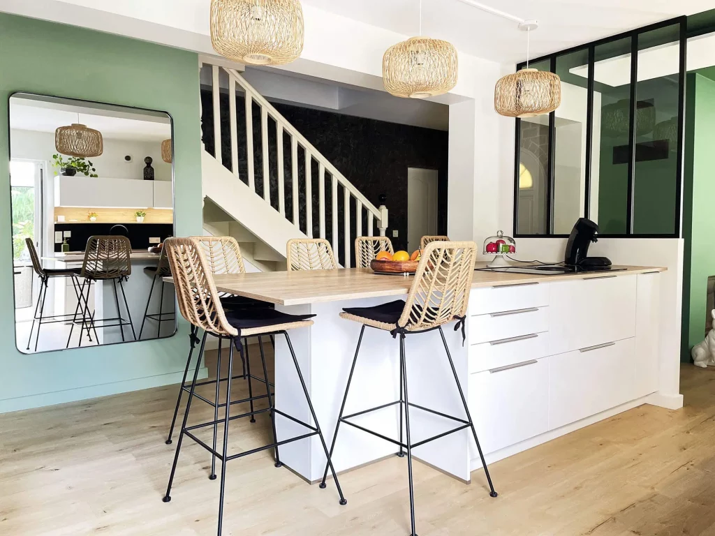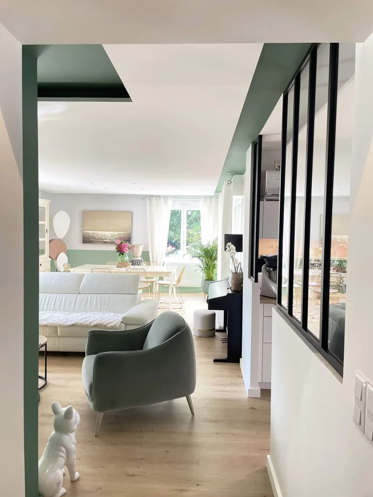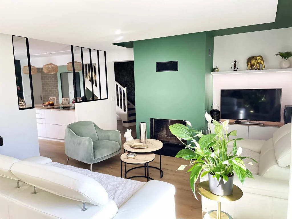 Dans la pièce de vie, ainsi que l’ensemble du rez-de-chaussée, le carrelage a été remplacé par un parquet en bois clair, apportant chaleur et confort. Les murs vêtus de blanc et de verts, apportent une touche de fraîcheur et de profondeur tout en maintenant une atmosphère sereine et élégante.