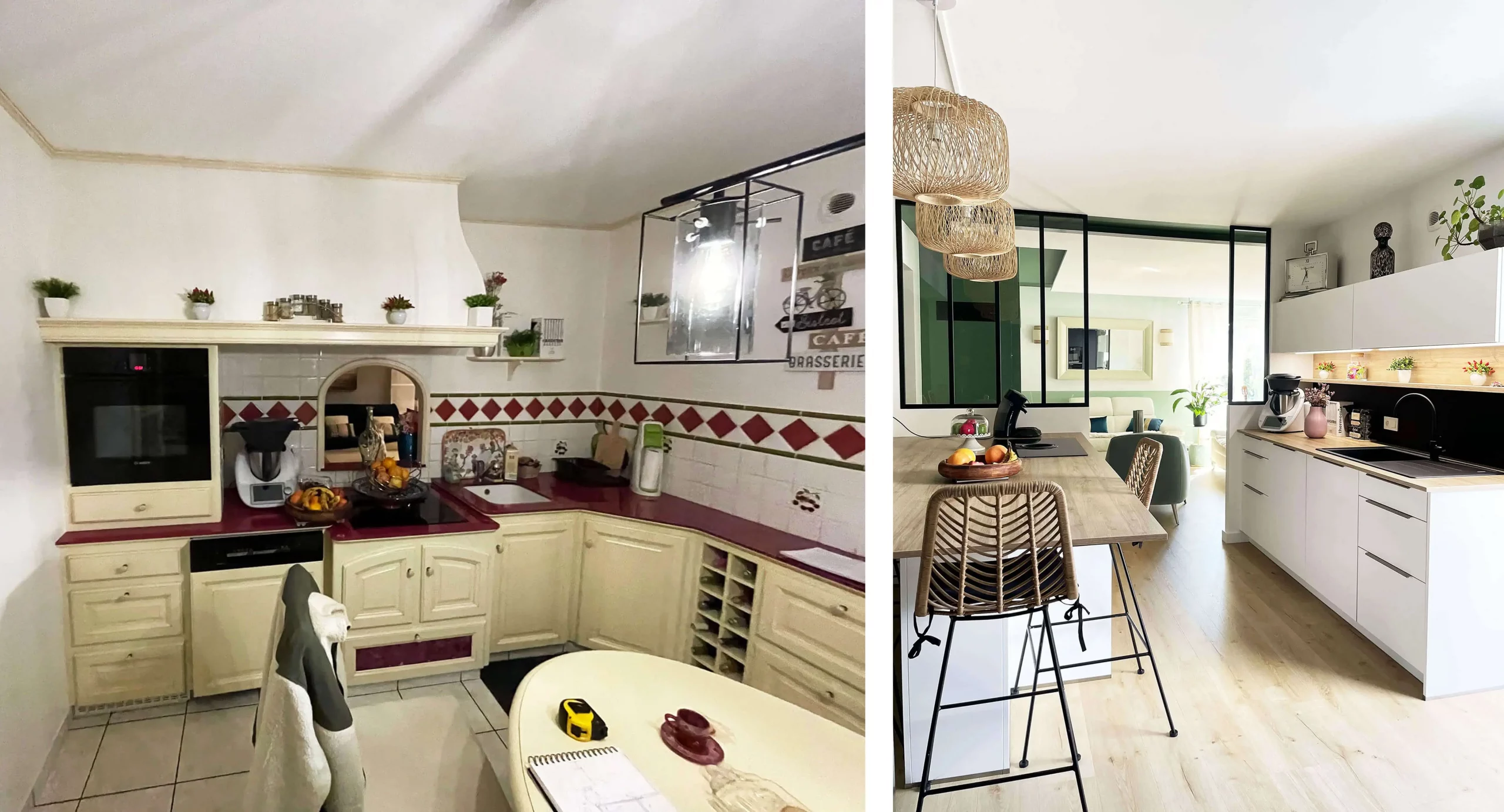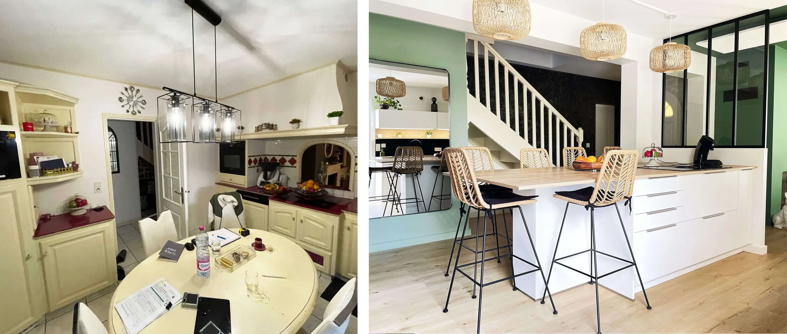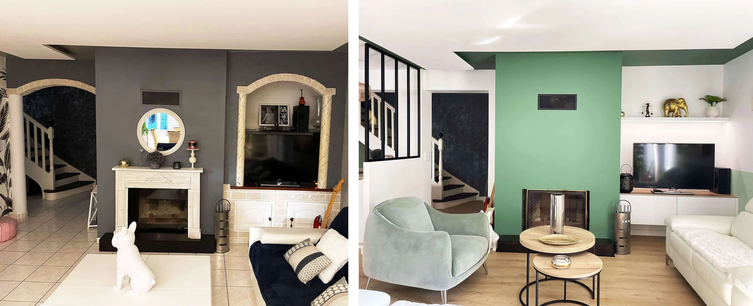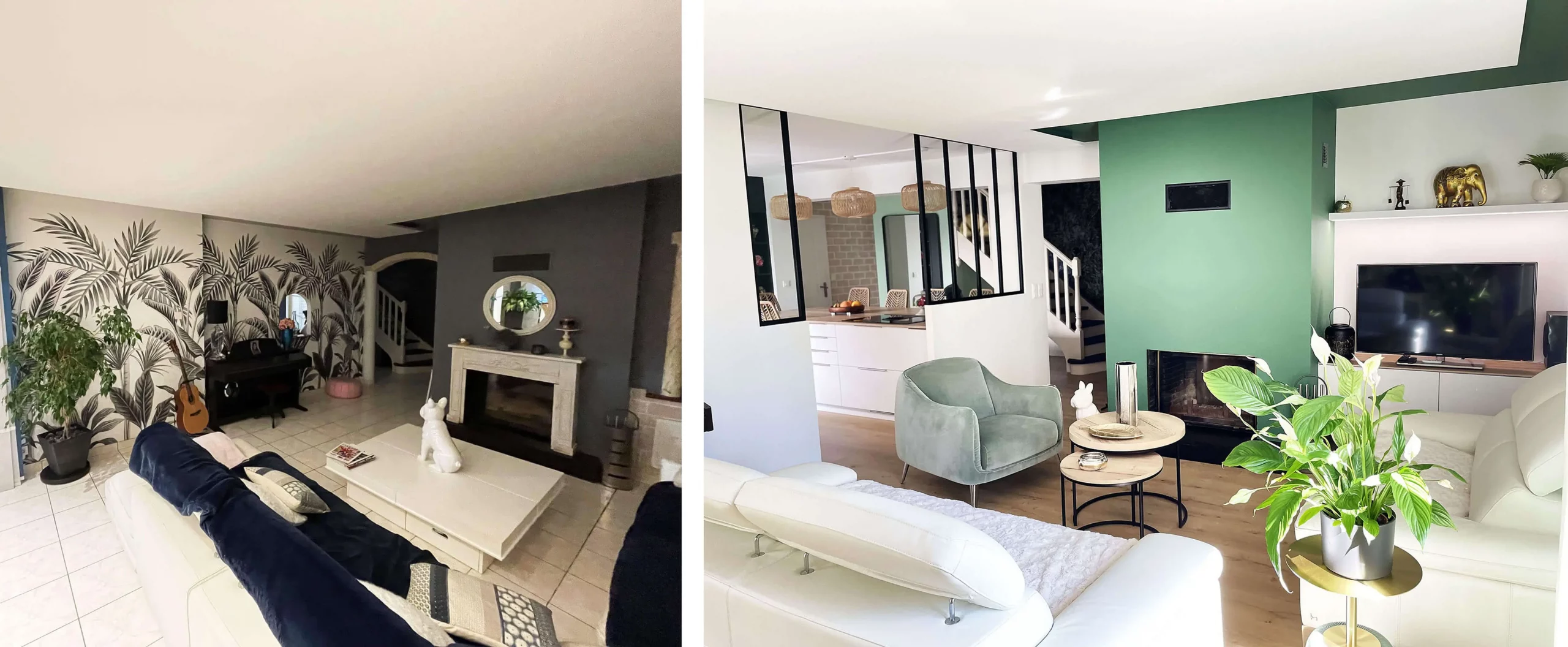 Dans la pièce de vie, ainsi que l’ensemble du rez-de-chaussée, le carrelage a été remplacé par un parquet en bois clair, apportant chaleur et confort. Les murs vêtus de blanc et de verts, apportent une touche de fraîcheur et de profondeur tout en maintenant une atmosphère sereine et élégante.