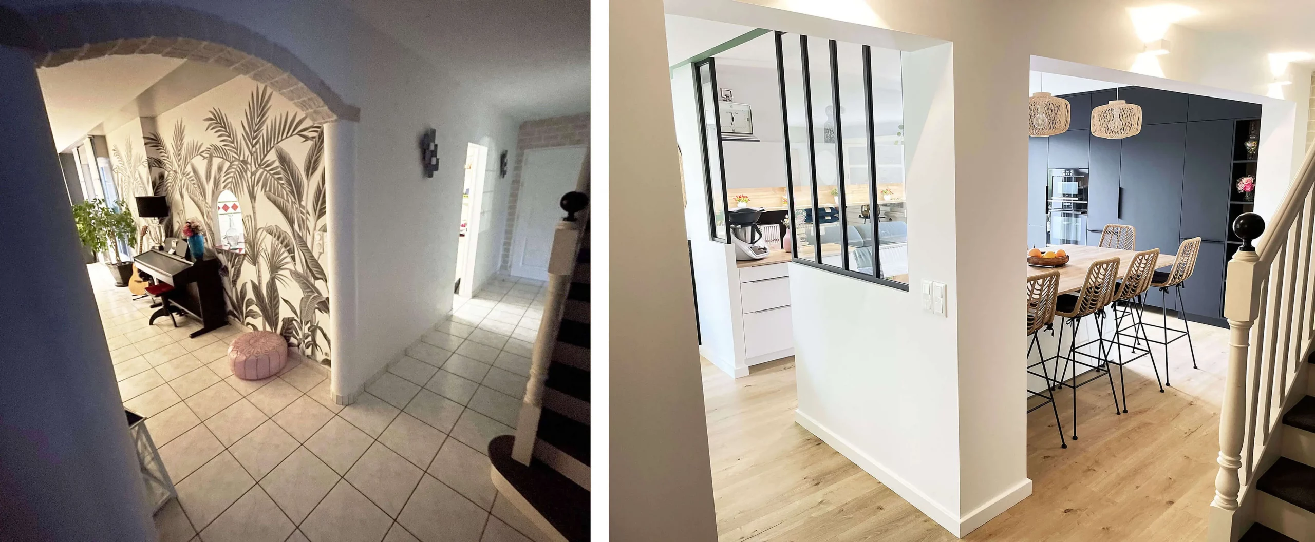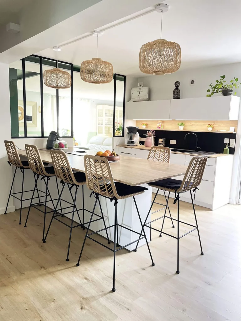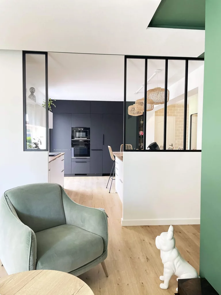 Dès l’entrée, l’impact de la lumière se fait immédiatement ressentir. En pénétrant dans la maison, la lumière naturelle de la cuisine s’invite à travers une verrière subtilement positionnée et des frangements intelligemment créés dans le couloir, créant une transition fluide entre les espaces et une ambiance accueillante. Ce jeu de lumière guide le regard vers la pièce de vie, baignée de clarté.