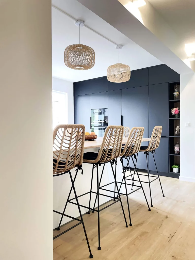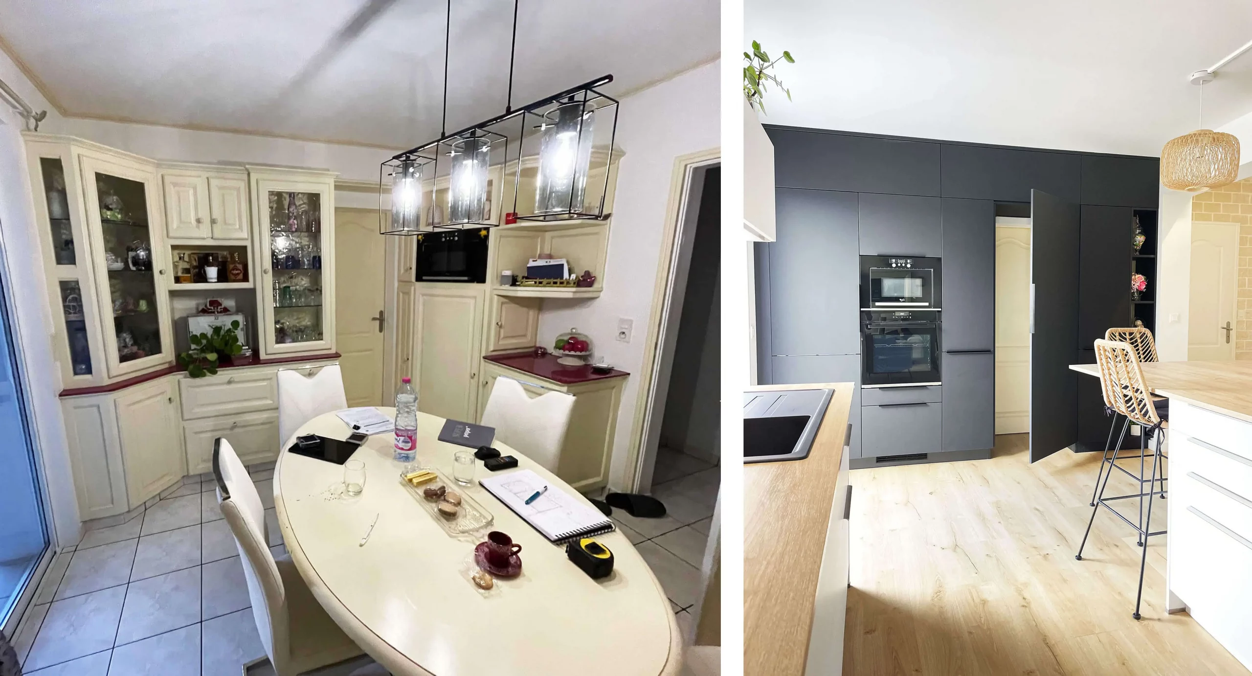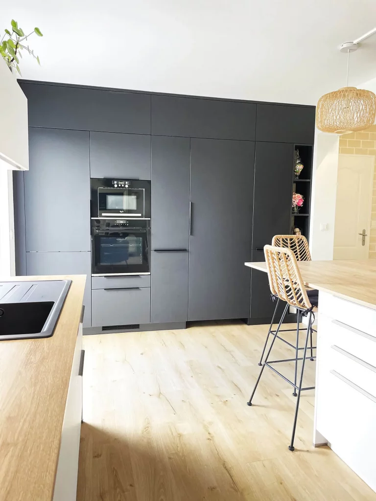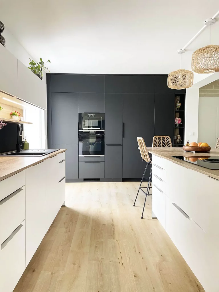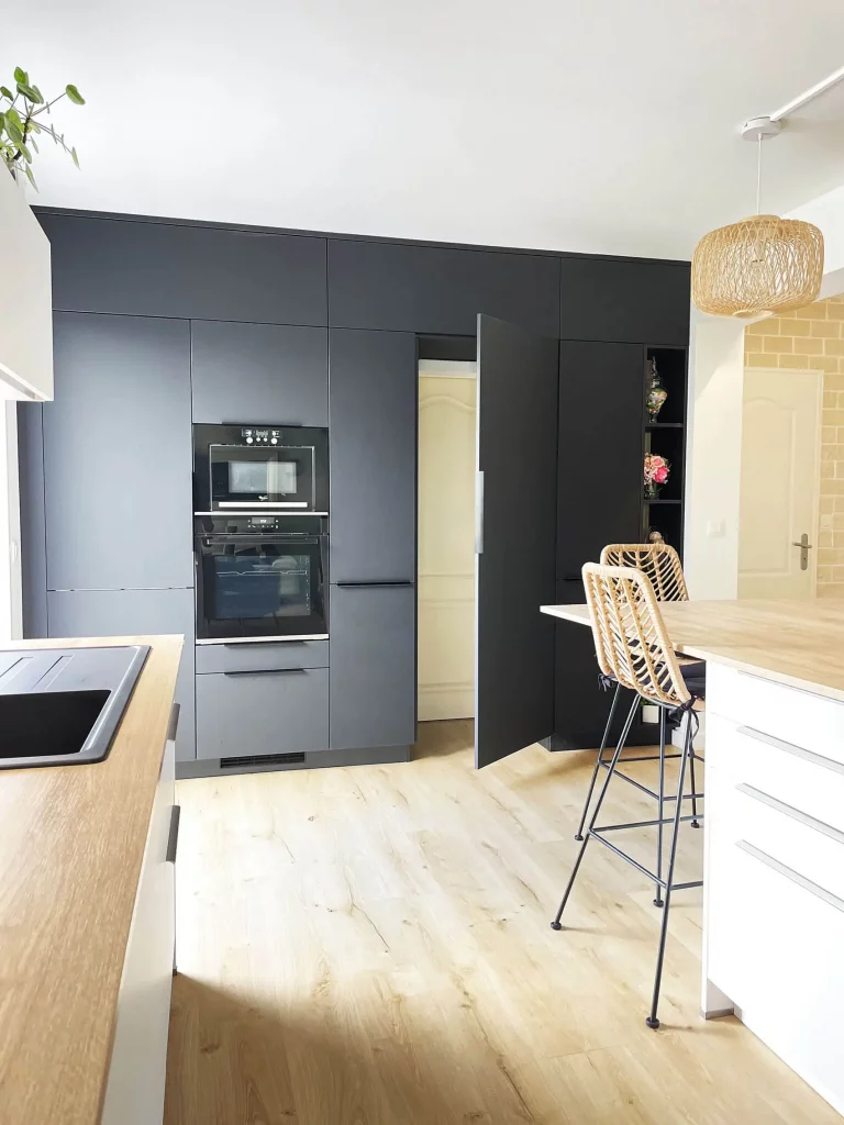La cuisine, partie centrale du projet, se distingue par son agencement raffiné. Le mur d’armoires, dissimulant un cellier, allie élégance et fonctionnalité. Les matériaux modernes et chaleureux renforcent l’esthétique de l’ensemble, tout en offrant un espace pratique et intemporel.