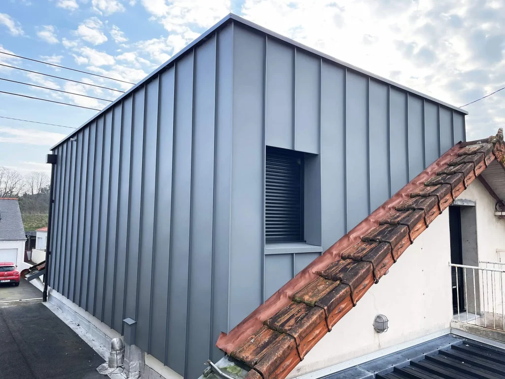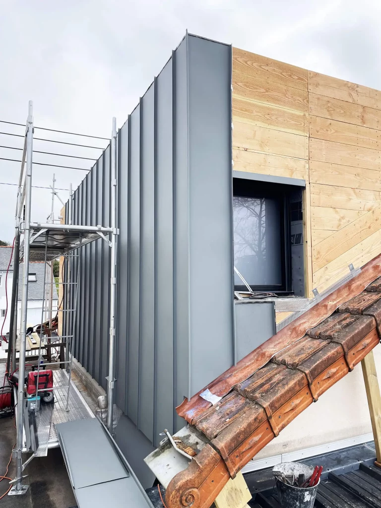 La démarche architecturale a été guidée par le souhait de créer une extension en harmonie avec l’existant tout en marquant un contraste subtil, mais net. La structure de l’extension a été réalisée en bois, un matériau noble, synonyme de solidité et de pérennité. La finition extérieure est un bardage en zinc apportant modernité et élégance.